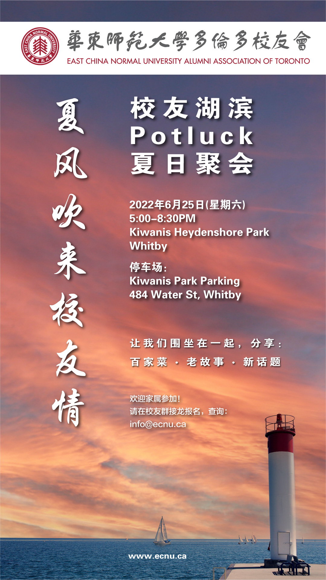 2022年6月25日(星期六)5:00-8:30PM Kiwanis Heydenshore park, Whitby 停车场: Kiwanis Park Parking484 Water St, Whitby 让我们围坐在一起,分享: 百家菜 · 老故事 · 新话题 *校友会将提供折叠式餐台、一次性餐具、瓶装水。请大家自带沙拉椅或折椅。 欢迎家属参加! 请在校友群接龙报名,查询: info@ecnu.ca
