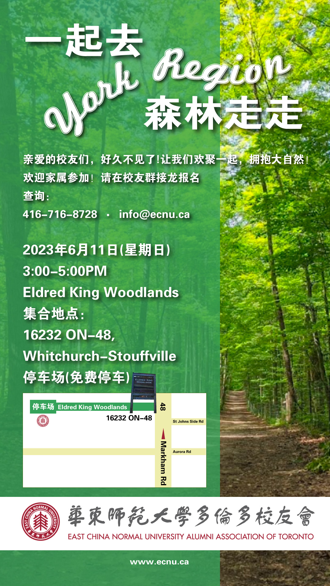 亲爱的校友们,好久不见了!让我们欢聚一起,拥抱大自然! 地点:Eldred King Woodlands 2023年6月11日(星期日)3:00-5:00PM 集合地点: 16232 ON-48, Whitchurch-Stouffville 停车场(免费停车) 活动结束后,尚有余兴的校友可自愿参加晚餐小聚,晚餐可在万锦市找家餐馆(大家推荐一下哪家合适),费用AA制。 欢迎家属参加! 请在校友群接龙报名,查询: info@ecnu.ca